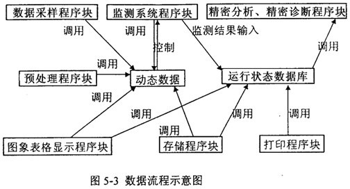 軟件的各個模塊通過動態(tài)數(shù)據(jù)和運(yùn)行狀態(tài)數(shù)據(jù)庫聯(lián)系在一起,在下位機(jī)中,監(jiān)測系統(tǒng)控制著動態(tài)數(shù)據(jù)的采集、存儲、顯示和預(yù)處理,同時把監(jiān)測結(jié)果存入各機(jī)組運(yùn)行狀態(tài)特征數(shù)據(jù)庫。在上位機(jī)中,詳細(xì)分析診斷程序塊調(diào)用運(yùn)行狀態(tài)數(shù)據(jù)庫,得出診斷結(jié)果并調(diào)用打印程序塊輸出。圖5-3為數(shù)據(jù)流程示意圖,圖5-4為監(jiān)測系統(tǒng)流程示意圖。