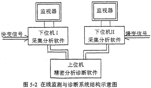 為了適應(yīng)日益更新的生產(chǎn)實際多種類型參數(shù)監(jiān)測和故障診斷的要求,建立由多臺微機(jī)并行運(yùn)行構(gòu)成的在線連續(xù)實時監(jiān)測與快速診斷系統(tǒng)。圖5-2為多微機(jī)在線監(jiān)測與診斷系統(tǒng)結(jié)構(gòu)示意圖。這樣做的優(yōu)點(diǎn)是: