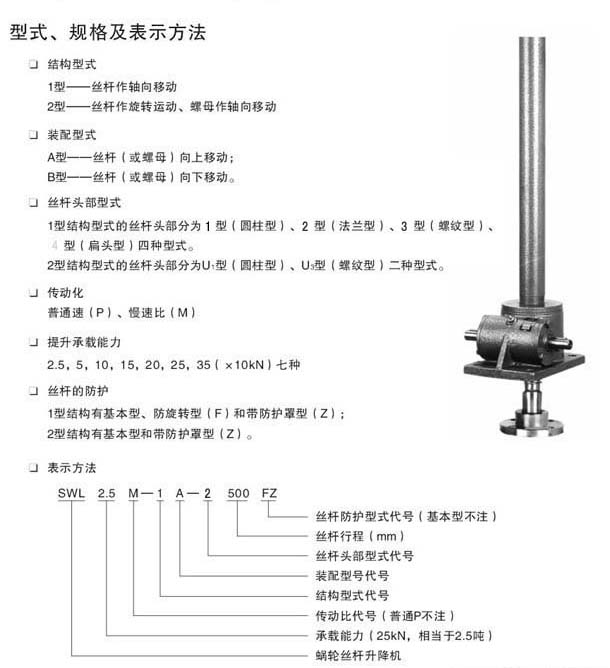 絲杠升降機(jī)廣泛應(yīng)用于機(jī)械、冶金、建筑、水利設(shè)備等行業(yè),具有起升、下降及借助輔件推進(jìn)、翻轉(zhuǎn)及各種高度位置調(diào)整等諸多功能.SWL蝸輪絲杠升降機(jī)是一種基礎(chǔ)起重部件,具有結(jié)構(gòu)緊湊、體積小、重量輕、動(dòng)力源廣泛、無噪音、安裝方便、使用靈活、功能多、配套形式多、可靠性高、使用壽命長(zhǎng)等許多優(yōu)點(diǎn)?梢詥闻_(tái)或組合使用,能按一定程序準(zhǔn)確地控制調(diào)整提升或推進(jìn)的高度,可以用電動(dòng)機(jī)或 其他動(dòng)力直接帶動(dòng),也可以手動(dòng)。它有不同的結(jié)構(gòu)形式和裝配形式,且提升高度可按用戶的要求定制。 。該裝置可以自鎖