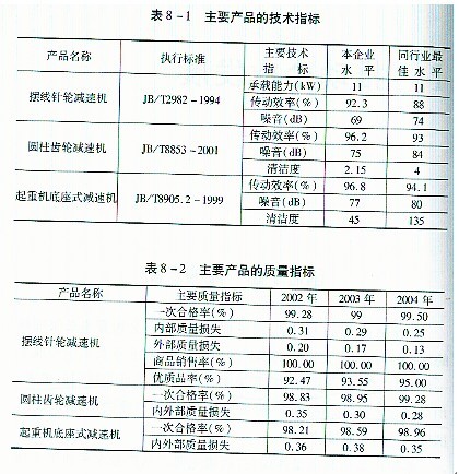 公司董事長張國林提出并率先在泰星減速機股份有限公司全面推行的以“三改、三制、三化”為主線的一系列的管理理念、管理模式、管理方法、運行機制和創(chuàng)新機制,不僅對公司的內(nèi)部管理產(chǎn)生了巨大的成效,取得了很好的企業(yè)效益,且得到了社會的廣泛認可,產(chǎn)生了很好的社會效應(yīng)和一定的理論效應(yīng)。 I 推動企業(yè)發(fā)展 創(chuàng)造了超一流的產(chǎn)品 泰星減速機股份有限公司正是認真貫徹了公司董事長張國林的“一保產(chǎn)品質(zhì)量,二保供貨期”的質(zhì)量思想,在企業(yè)員工中形成了一種“用戶在我心中、質(zhì)量在我手中、用戶的需求就是我們的追求、用戶滿意才有我們的滿意”的質(zhì)量共識,為用戶提供了國內(nèi)領(lǐng)先、國際一流的高質(zhì)量的產(chǎn)品。 泰星產(chǎn)品的高質(zhì)量體現(xiàn)在:代表主要產(chǎn)品質(zhì)量水平的主要技術(shù)指標(biāo)遠遠超過了同行業(yè)的最佳水平。見表8—1。 主要產(chǎn)品的質(zhì)量指標(biāo)遠遠超過了國內(nèi)的最好水平。主要產(chǎn)品的質(zhì)量水平見表8—2。 到2004年泰星減速機股份有限公司的產(chǎn)品合格率連續(xù)11年達到100%,一等品率2004年達到95.3%,優(yōu)等品率達到72.50%。 泰星公司生產(chǎn)的產(chǎn)品噪音低,無污染,環(huán)境指標(biāo)達到了國內(nèi)的同行業(yè)的領(lǐng)先水平。  增強了研發(fā)能力 公司董事長張國林認識到:“技術(shù)創(chuàng)新是企業(yè)發(fā)展的關(guān)鍵。沒有先進的技術(shù),先進的設(shè)備和工藝,就不可能生產(chǎn)出質(zhì)量過硬的產(chǎn)品,企業(yè)也無法立足于市場,擴大規(guī)模,企業(yè)發(fā)展也就成為一句空話”。因此,董事長張國林非常重視企業(yè)科技開發(fā)工作,一方面,不斷加大公司的科技研發(fā)費用的投人,早在2000年泰星減速機股份有限公司的研究與開發(fā)費用已經(jīng)占到公司當(dāng)年銷售收入的9.7%,遠遠超過了國內(nèi)同行業(yè)企業(yè)的先進水平,已經(jīng)接近國外大型跨國公司10%的最好水平,泰星股份公司的研究與開發(fā)費用還在以每年20%的速度在增長;另一方面,為了提高企業(yè)的技術(shù)研發(fā)能力,泰星股份公司于1998年初就成立了減速機研究所,研究所取得了豐碩的科研成果,他們自主設(shè)計、自主研制、自主開發(fā)的9000系列擺線釷輪減速機、9000系列硬齒面減速機、9000系列中硬齒面減速機達到了國際21世紀(jì)先進水平。 營造了整潔的工作環(huán)境 泰星股份公司董事長張國林認為:一方面,優(yōu)美的廠區(qū)環(huán)境,是企業(yè)領(lǐng)導(dǎo)層富有戰(zhàn)略眼光的重要反映,也是企業(yè)形象和職工精神面貌的綜合體現(xiàn)。它有利于避免因外部環(huán)境干擾而引起的不良心理和生理現(xiàn)象,激發(fā)職工的勞動熱情,提高勞動生產(chǎn)率;另一方面,公司的員工每天要在公司工作八個小時,公司、工廠、車間的環(huán)境美化了,能為員工營造一個舒適的工作環(huán)境,保證員工心情愉快,使員工處在一種愉悅的工作狀態(tài)中,這樣也有利于產(chǎn)品質(zhì)量的提高。因此,按照定制工藝的要求,本著使人機物處于最佳優(yōu)化組合狀態(tài)的原則,對公司的各個部門,車間內(nèi)部進行了合理的平面布置,并重點抓了“兩通”“三化”工程建設(shè),不僅保證了車間內(nèi)的工作環(huán)境清潔、整齊,且使整個廠區(qū)布局合理、美麗、整潔。難怪國外的 同行來星股份公司考察時,發(fā)出了這樣的贊嘆:“簡直就是一座花園式的工廠”。 形成了愛廠如家的工作熱情 沒有工作制度,沒有任何約束,員工自愿一天為企業(yè)工作14個小時。這種工作熱情在目前的市場經(jīng)濟社會中是罕見的。泰星公司員工的這種工作熱情來源于張國林董事長提出的“能上能下,競爭上崗:實績計酬”,“生活溫暖化”等一系列管理理念、管理方法在太星中的推行張董事長的這些管理理念與管理方法的實施,在企業(yè)內(nèi)部為員工們創(chuàng)造了一種發(fā)揮自己的才能,發(fā)揮自已的水平:一切憑實績講話,~切憑數(shù)據(jù)講話的氛圍。讓員工們也感受到了為企業(yè)工作的甜頭,感受到了他們的切身利益是與企業(yè)的榮辱:興衰密不可分的。因此,員工們愿意也樂意為企業(yè)工作。 創(chuàng)造了領(lǐng)先同行業(yè)十年的輝煌業(yè)績 由于董事長張國林治企有方,使泰星公司得到了快速的發(fā)展。在1993年,衡量公司經(jīng)濟效益的主要指標(biāo):資金利潤率、銷售利潤率、成本費用利潤率、總資產(chǎn)貢獻率、流動資金周轉(zhuǎn)率、全員勞動生產(chǎn)率:產(chǎn)品銷售率、質(zhì)量損失率、新產(chǎn)品產(chǎn)值率以及萬元總產(chǎn)值綜合能耗均保持在全國同行業(yè)的領(lǐng)先水平。 在2003年泰星股份公司的主要經(jīng)濟效益指標(biāo)分別為:總資產(chǎn)零獻率為29.25%,資本保值增值率127.83%,資金周轉(zhuǎn)率2.64次,成本費用利潤17.33%,全員勞動產(chǎn)生產(chǎn)率22.36萬元/人,產(chǎn)銷率100.30,產(chǎn)品質(zhì)量等級品率120.72%,質(zhì)量損失率為0.38,新產(chǎn)品產(chǎn)值率25.08,萬元總產(chǎn)值綜合能耗為0.158噸/萬元。 贏得了客戶的信賴 目前,泰星減速機股份有限公司的用戶已經(jīng)遍布全國各地,正在擴展到