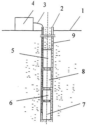 1-地面;2-油管;3-電纜;4-電源;5-螺桿泵;6-減速器;7-潛油電機;8-保護器;9-套管