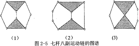 對(duì)于(5,5)來(lái)說(shuō),只有一種連接方式,作為一種混合動(dòng)力驅(qū)動(dòng)系統(tǒng)已有人做過(guò)研究,在本論文中,不能滿足設(shè)計(jì)要求,因此不可。欢9,11)及以上又有40個(gè)(或更多)運(yùn)動(dòng)鏈之多,且構(gòu)件多結(jié)構(gòu)復(fù)雜,研究起來(lái)非常困難,暫不考慮;先考慮(7,8)七桿八副機(jī)構(gòu),其構(gòu)建數(shù)量不是太多,結(jié)構(gòu)不是太復(fù)雜,共有3個(gè)運(yùn)動(dòng)鏈(如圖2-5),特定化后又有11種(排除同構(gòu)的機(jī)構(gòu))特定化導(dǎo)出機(jī)構(gòu),可以從中選擇可能適合的方案,因此以下將對(duì)(7,8)來(lái)詳細(xì)分析研究。