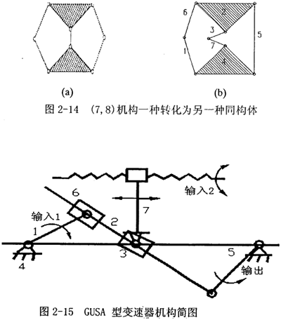 方案三:在眾多已有機(jī)構(gòu)類型篩選當(dāng)中,發(fā)現(xiàn)機(jī)構(gòu)式脈動(dòng)無(wú)級(jí)變速器中的一種:三相并列連桿式(GUSA)脈動(dòng)無(wú)級(jí)變速器采用的機(jī)構(gòu)可以供鑒。這咱變速器設(shè)計(jì)原理為:采用三相并列結(jié)構(gòu),作為輸入機(jī)構(gòu)的是相位差為120度的三曲拐曲軸,每個(gè)曲拐帶動(dòng)一套Ⅲ級(jí)七桿機(jī)構(gòu),如圖所示是(7,8)圖譜中(1)的一種同構(gòu)機(jī)構(gòu),圖2-14顯示了它的轉(zhuǎn)化和各桿件的標(biāo)號(hào),可以與圖2-15結(jié)構(gòu)簡(jiǎn)圖——對(duì)應(yīng)。